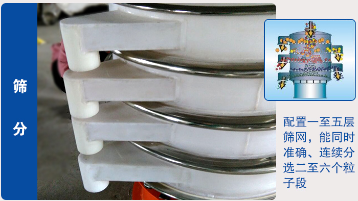 篩分就是把固體顆粒分成大小相等的不同粒子組。單臺(tái)系列篩分機(jī)可配置一至五層篩網(wǎng),能同時(shí)準(zhǔn)確、連續(xù)分選二至六個(gè)粒子段;分級(jí)精度達(dá)95%以上。