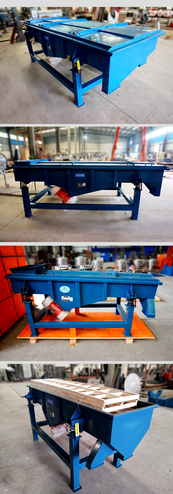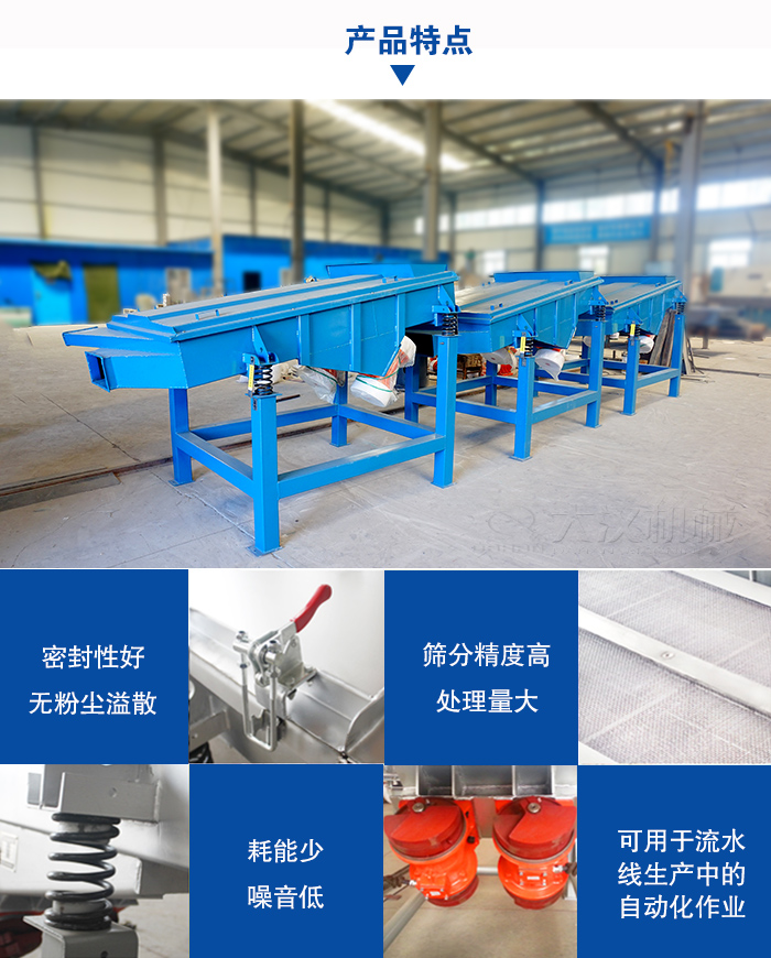 優勢 碳鋼直線振動篩是一種用途比較廣泛的效率高篩分設備,利用振動電機激振作為振動源,使物料在篩網上被拋起,同時向前作直線運動