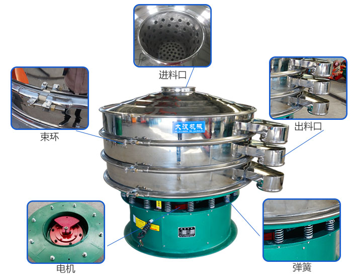 旋振篩主要由進料口、防塵蓋、出料口、束環(huán)、篩網(wǎng)、配重塊、上部重錘、振動體、振動電機、彈簧、下部重錘、機座等部分組成。