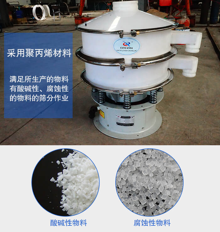 塑料振動(dòng)篩也叫做聚丙烯振動(dòng)篩,塑料防腐蝕振動(dòng)篩,塑料旋振篩采用聚丙烯材料也叫PP材料通過(guò)特殊的加工工藝制作的用于滿(mǎn)足所生產(chǎn)的物料有酸堿性、腐蝕性的物料的篩分作業(yè)。塑料振動(dòng)篩從篩框、篩網(wǎng)到清網(wǎng)裝置完全采用非金屬材料,徹底排除了一些特殊物料與金屬接觸會(huì)產(chǎn)生化學(xué)反應(yīng)的問(wèn)題。