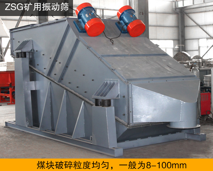 ZSG礦用振動(dòng)篩由振動(dòng)電機(jī)、篩體、篩網(wǎng)、減振裝置及座架等組成。該系列振動(dòng)篩采用新型能耗低振動(dòng)電機(jī)作振動(dòng)源,固定在篩箱上兩臺(tái)相同的振動(dòng)電機(jī)做相反方向自同步旋轉(zhuǎn),振動(dòng)電機(jī)所帶的偏心塊在旋轉(zhuǎn)時(shí)各個(gè)瞬間位置所產(chǎn)生的離心力之分力沿拋擲方向作往復(fù)運(yùn)動(dòng),使支承在減振裝置上的整個(gè)篩體沿激振力方向作周期性往復(fù)振動(dòng),煤塊在篩面上沿直線方向作拋物線運(yùn)動(dòng),煤塊從入料端落入篩網(wǎng)后,迅速前進(jìn)、松散透篩,完成篩分作業(yè),以合理匹配篩網(wǎng)達(dá)到篩分的目的。