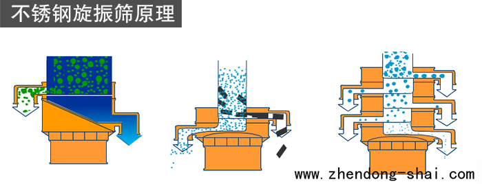 研磨材料通過不銹鋼旋振篩入料口進(jìn)入設(shè)備內(nèi),根據(jù)不同篩分要求,物料會經(jīng)過1-5層不同目數(shù)的篩網(wǎng),并且在這個(gè)過程中,位于各層的篩網(wǎng)下的彈跳球不斷撞擊篩網(wǎng),使物料能夠順暢的篩分,避免物料堵網(wǎng),不同規(guī)格的物料通過各層對應(yīng)目數(shù)的篩網(wǎng)從其出料口排出,終實(shí)現(xiàn)篩分或過濾作業(yè)。調(diào)節(jié)上、下兩端的相位角,還可以改變物料在篩面上的運(yùn)動軌跡。