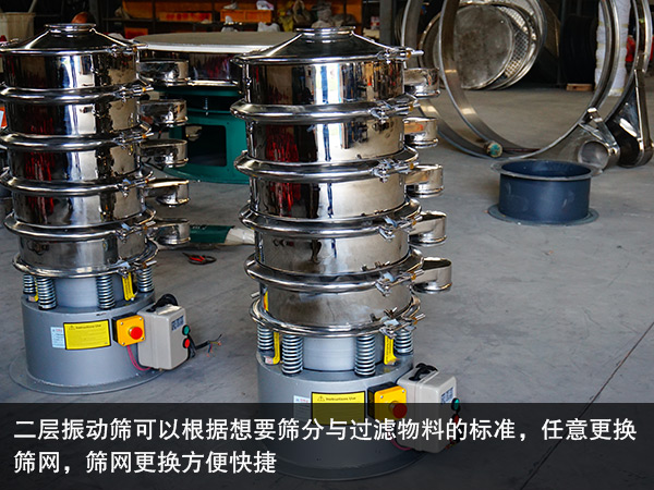 不銹鋼旋振篩是在碳鋼旋振篩基礎(chǔ)上,設(shè)計出的具有國內(nèi)先進水平的振動篩分設(shè)備,用于篩分對材質(zhì)有特殊要求的物料。二層振動篩與不銹鋼旋振篩是同一種產(chǎn)品不過有兩種叫法,此篩機是采用新型YZUL系列單法蘭振動電機,具有穩(wěn)定的激振力。這款振動篩可以篩分各種物料具有篩分特殊性、高粘度、細粒物料、細粉、微粉、及干、濕物料等多種物料,是篩分行業(yè)的好幫手。二層振動篩可以根據(jù)想要篩分與過濾物料的標準,任意更換篩網(wǎng),篩網(wǎng)更換方便快捷。