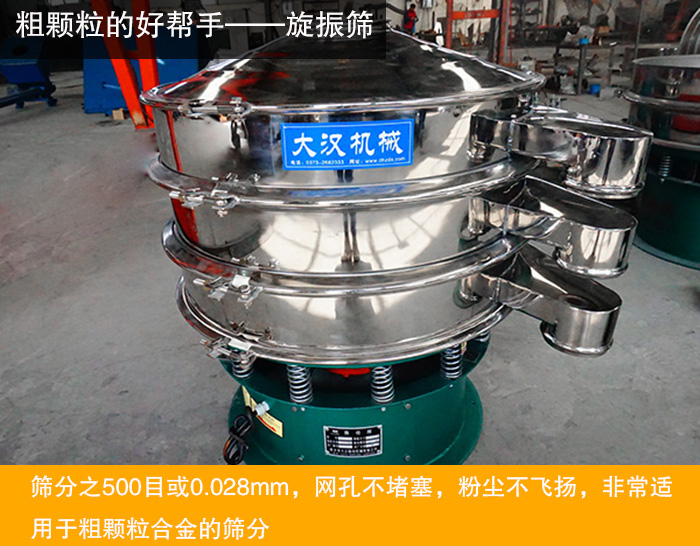旋振篩采用直立式振動電機做為激振源,電機上、下兩端安裝偏心重錘,將電機的旋轉運動轉變為水平、垂直、傾斜的三次元運動,再把這個歌運動傳遞給篩面。調節上下兩端的相位角,可以改變物料的運動軌跡。旋振篩篩分效率高,設計精巧耐用,的粉類、粘液均可篩分。并且換網容易,操作簡單,清洗方便。可篩分之500目或0.028mm,網孔不堵塞,粉塵不飛揚,非常適用于粗顆粒合金的篩分。