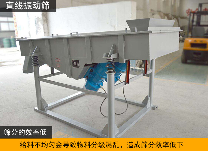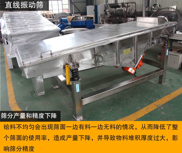進料不均勻時,就會出現篩面一邊有料一邊無料的情況,從而降低了整個篩面的使用率,造成產量達不到要求的問題。除此之外,由于進料不均勻,一側物料堆積太厚。一旦物料堆積厚度過大,將影響篩分效果精細度。達不到預期篩分效果。