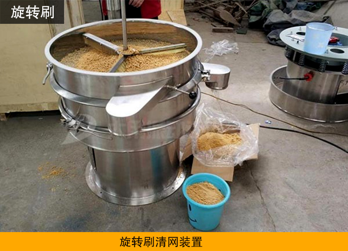 旋轉(zhuǎn)刷清網(wǎng)裝置是由圓柱形硅膠組成,將旋轉(zhuǎn)刷安裝在篩框中心位置,有聯(lián)軸器連接,啟動(dòng)篩機(jī)時(shí)旋轉(zhuǎn)刷同時(shí)啟動(dòng),從而對(duì)篩框底部進(jìn)行清網(wǎng)的工作,常用機(jī)型為搖擺篩