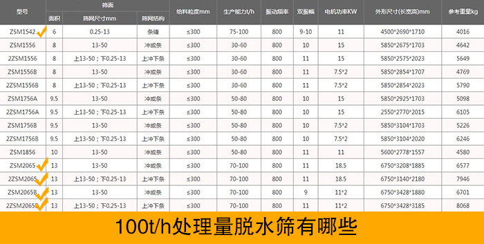 脫水篩中,型號眾多,以大漢脫水篩為例,其中處理量能達到100t/h的有以下幾種:ZSM1542,ZSM2065,2ZSM2065,ZSM2065B,2ZSM2065B等。具體參數如下: